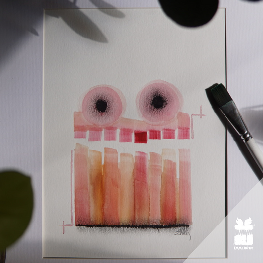 🤖💀🎨#112 "Cobalt Monocular Guardian: Crimson Square Incisors" Aquarell Monster Kunst