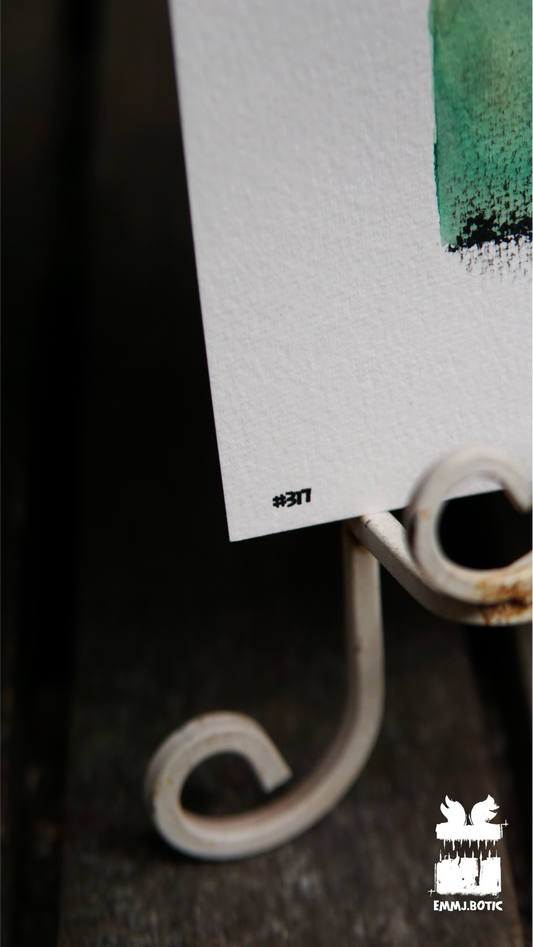 🤖💀🎨#317 "Verdant Mosaic Monster: Emerald Gaze and Circular Grin" Aquarell Monster Kunst